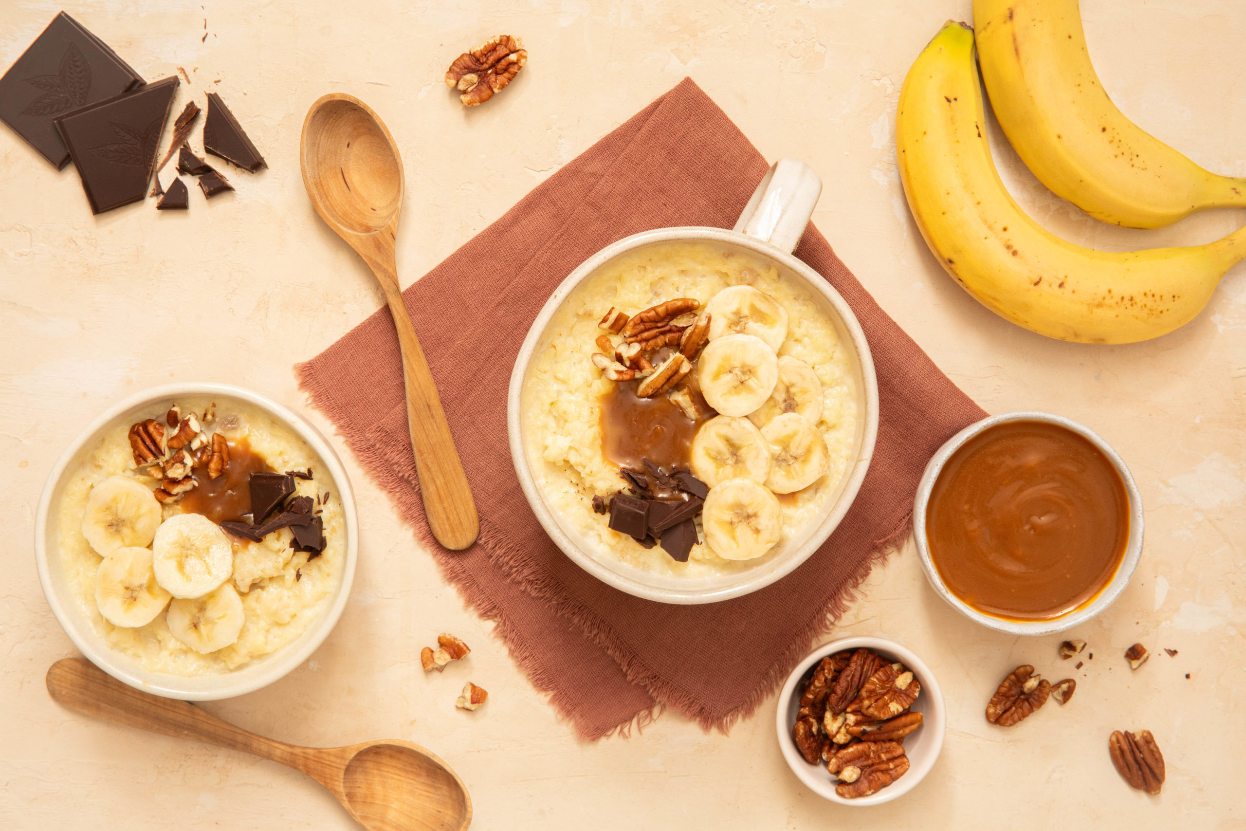 3. Servez votre préparation dans des bols. Ajoutez en topping du caramel au beurre salé, des rondelles de bananes, des éclats de chocolat noir, et quelques noix de pécan concassées.